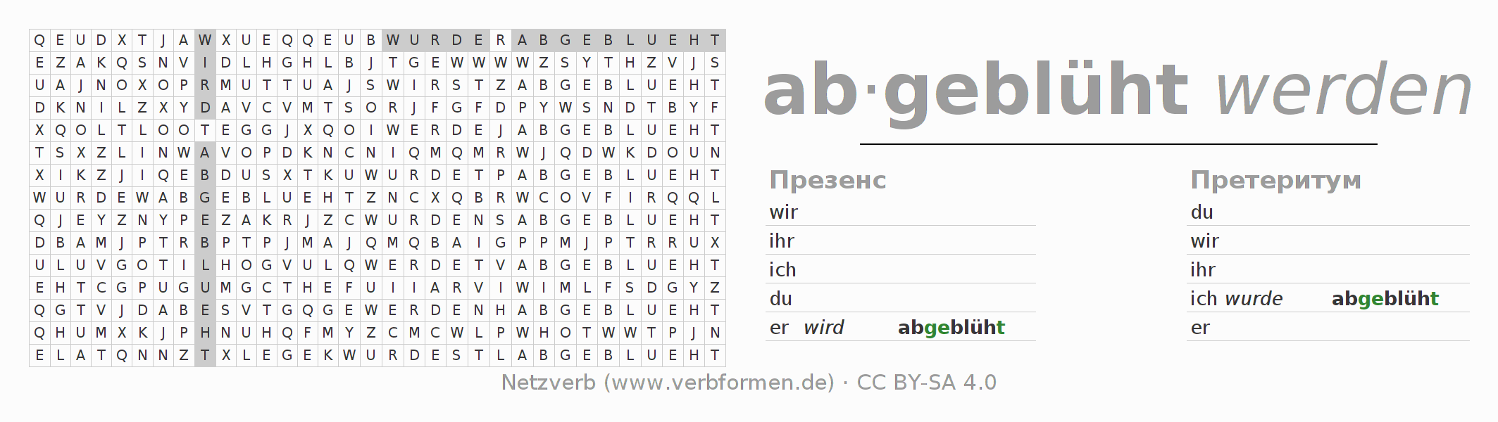 Глагольные таблицы, содержащие все формы глагола abblühen, для наглядности объединены в одну общую таблицу.