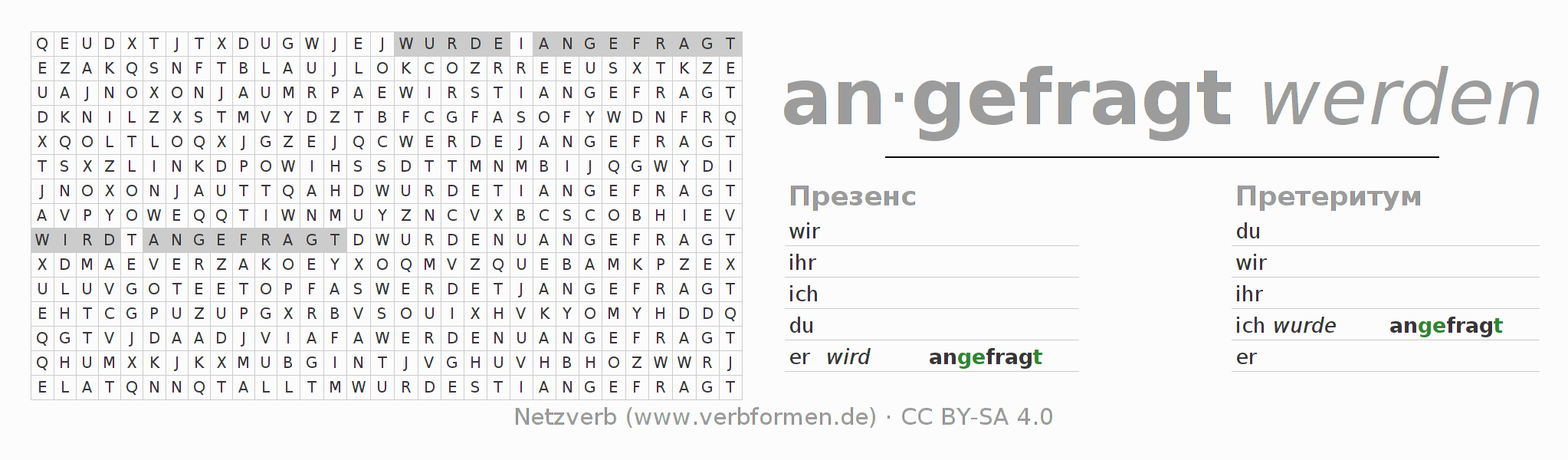 Рабочие материалы служат обучением спряжениям глагола anfragen на уроке и при самообучении. Рабочие материалы могут быть свободно использованы в рамках лицензии CC BY-SA 4.0 в виде Открытых образовательных ресурсов(ООР) например могут быть бесплатно использованы на уроке. Для этого имеется много различных типов рабочих материалов для глагола anfragen (regelm) в наличии. Это таблицы спряжений, головоломки и игры. Весь учебный материал доступен бесплатно как файлы PDF, в виде изображений или как интерактивная версия браузера. В дополнение к задачам, имеются бесчисленные примеры для anfragen а также помощь в использовании глаголов.