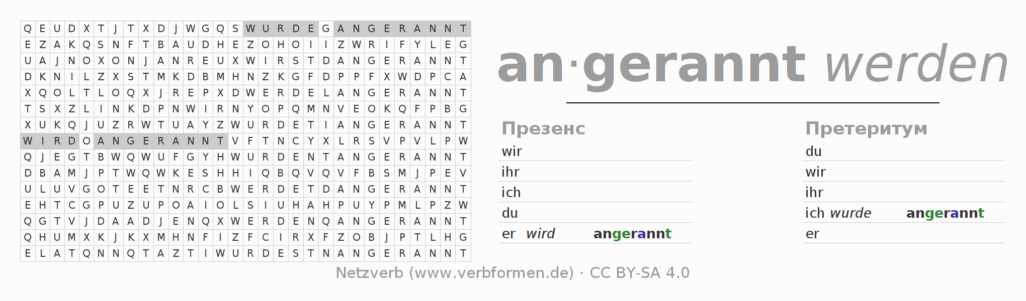 С помощью этих головоломок по поиску слов Вы можете подходящим для Вас способом изучать спряжение немецкого глагола anrennen.