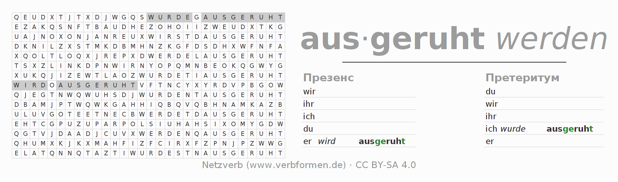 С помощью этих головоломок по поиску слов Вы можете подходящим для Вас способом изучать спряжение немецкого глагола ausruhen.