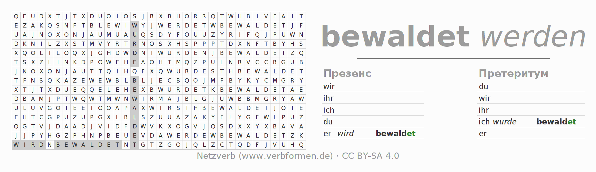 С помощью этих головоломок по поиску слов Вы можете подходящим для Вас способом изучать спряжение немецкого глагола bewalden.