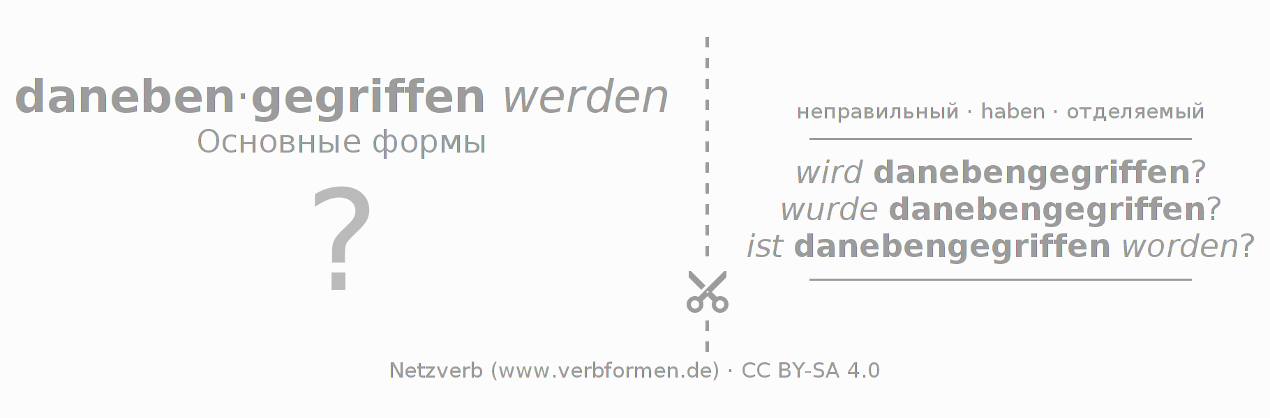 Глагольные таблицы, содержащие все формы глагола danebengreifen, для наглядности объединены в одну общую таблицу.