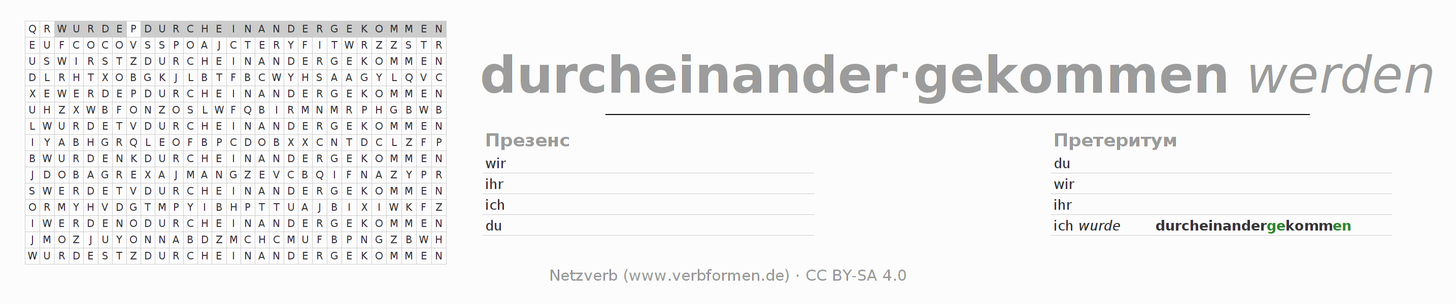 Рабочие материалы служат обучением спряжениям глагола durcheinanderkommen на уроке и при самообучении. Рабочие материалы могут быть свободно использованы в рамках лицензии CC BY-SA 4.0 в виде Открытых образовательных ресурсов(ООР) например могут быть бесплатно использованы на уроке. Для этого имеется много различных типов рабочих материалов для глагола durcheinanderkommen в наличии. Это таблицы спряжений, головоломки и игры. Весь учебный материал доступен бесплатно как файлы PDF, в виде изображений или как интерактивная версия браузера. В дополнение к задачам, имеются бесчисленные примеры для durcheinanderkommen а также помощь в использовании глаголов.