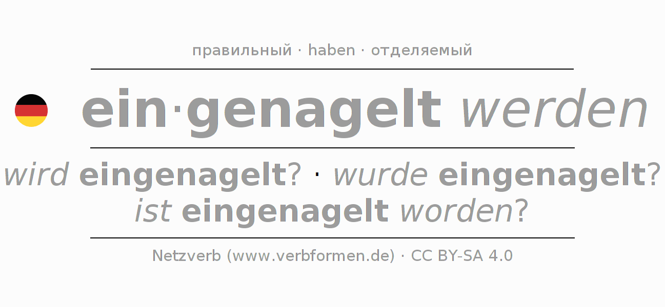Глагольные таблицы, содержащие все формы глагола einnageln, для наглядности объединены в одну общую таблицу.