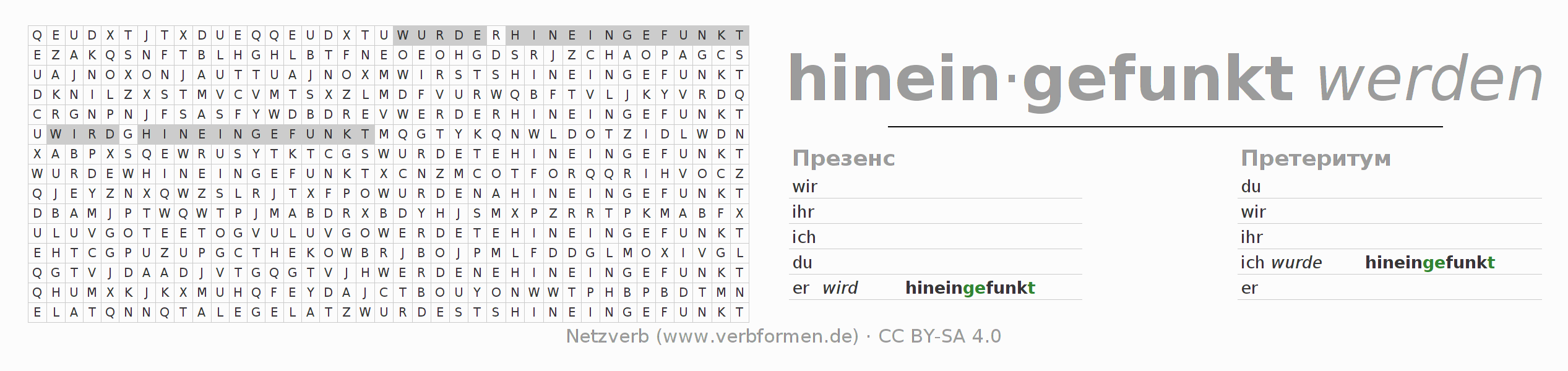 Рабочие материалы служат обучением спряжениям глагола hineinfunken на уроке и при самообучении. Рабочие материалы могут быть свободно использованы в рамках лицензии CC BY-SA 4.0 в виде Открытых образовательных ресурсов(ООР) например могут быть бесплатно использованы на уроке. Для этого имеется много различных типов рабочих материалов для глагола hineinfunken в наличии. Это таблицы спряжений, головоломки и игры. Весь учебный материал доступен бесплатно как файлы PDF, в виде изображений или как интерактивная версия браузера. В дополнение к задачам, имеются бесчисленные примеры для hineinfunken а также помощь в использовании глаголов.