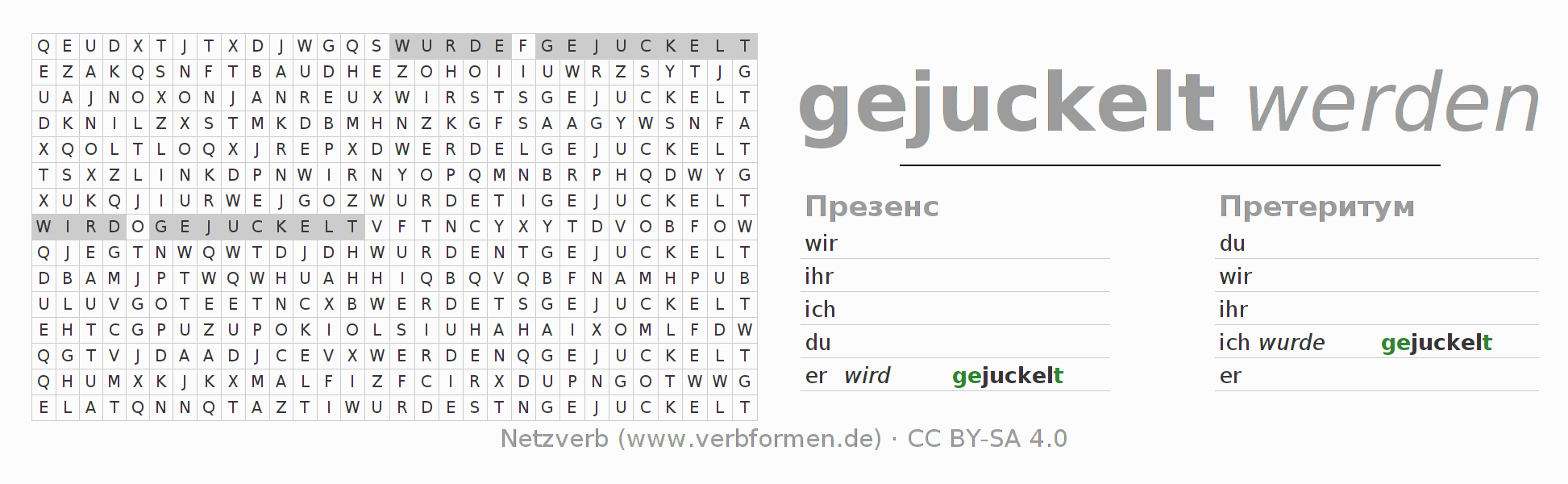 С помощью этих головоломок по поиску слов Вы можете подходящим для Вас способом изучать спряжение немецкого глагола juckeln.