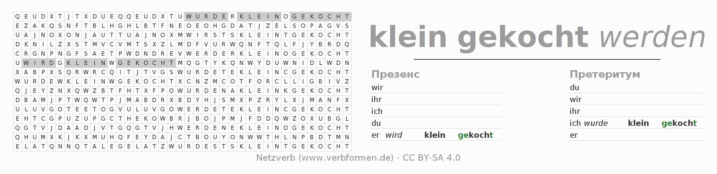 С помощью этих головоломок по поиску слов Вы можете подходящим для Вас способом изучать спряжение немецкого глагола kleinkochen.