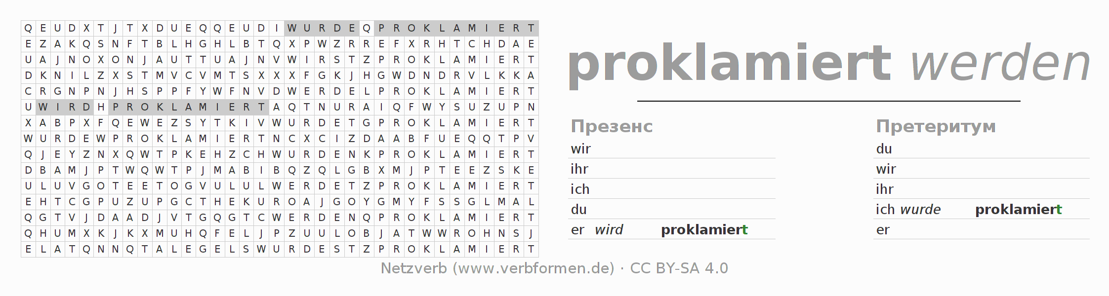 С помощью этих головоломок по поиску слов Вы можете подходящим для Вас способом изучать спряжение немецкого глагола proklamieren.