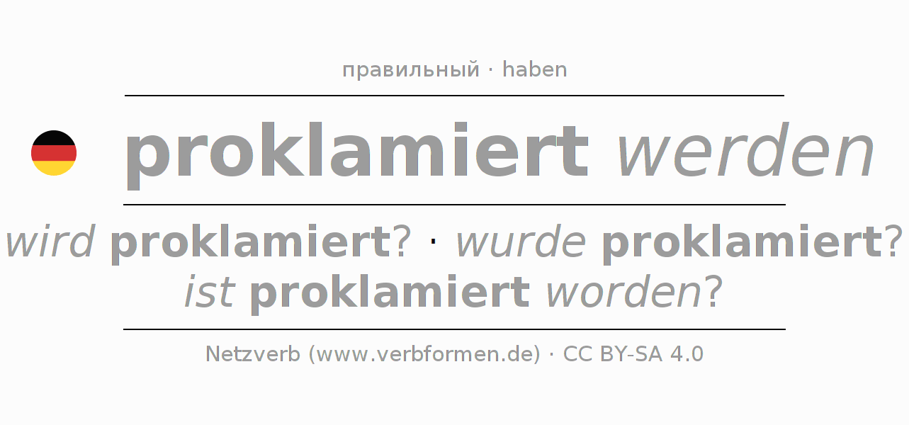Глагольные таблицы, содержащие все формы глагола proklamieren, для наглядности объединены в одну общую таблицу.