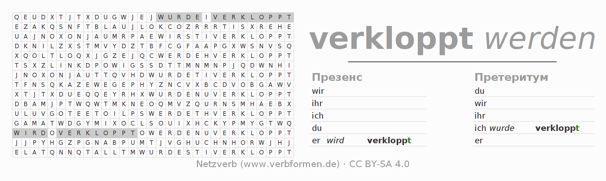 С помощью этих головоломок по поиску слов Вы можете подходящим для Вас способом изучать спряжение немецкого глагола verkloppen.