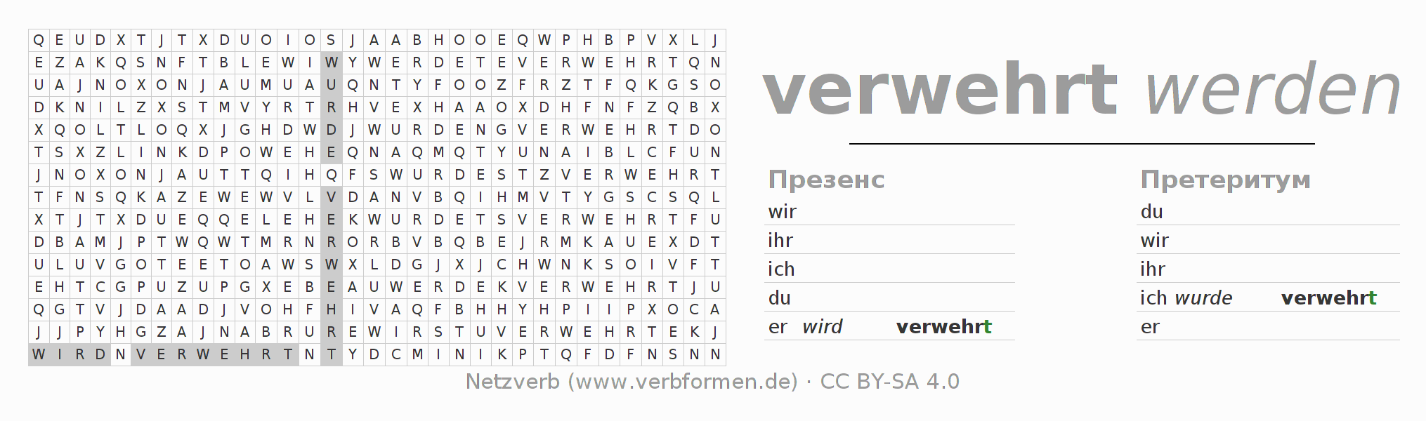 Рабочие материалы служат обучением спряжениям глагола verwehren на уроке и при самообучении. Рабочие материалы могут быть свободно использованы в рамках лицензии CC BY-SA 4.0 в виде Открытых образовательных ресурсов(ООР) например могут быть бесплатно использованы на уроке. Для этого имеется много различных типов рабочих материалов для глагола verwehren в наличии. Это таблицы спряжений, головоломки и игры. Весь учебный материал доступен бесплатно как файлы PDF, в виде изображений или как интерактивная версия браузера. В дополнение к задачам, имеются бесчисленные примеры для verwehren а также помощь в использовании глаголов.