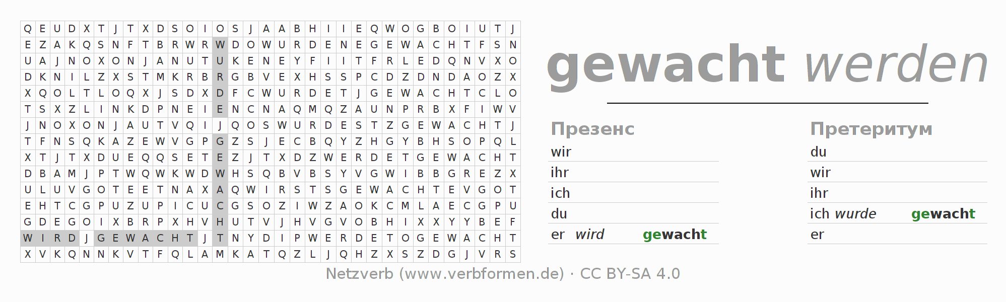 С помощью этих головоломок по поиску слов Вы можете подходящим для Вас способом изучать спряжение немецкого глагола wachen.