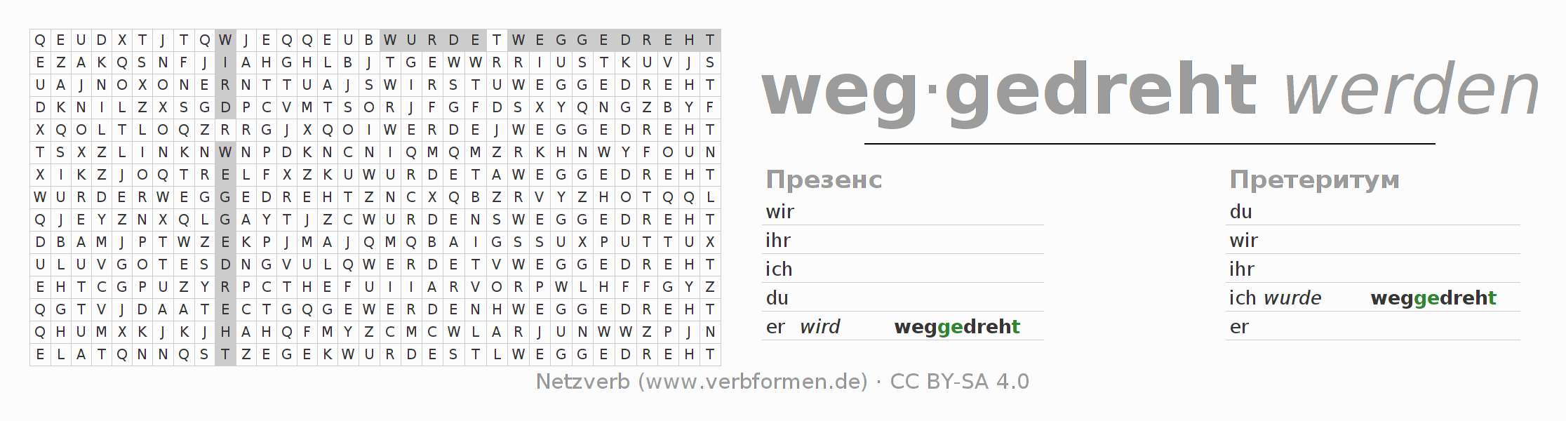 С помощью этих головоломок по поиску слов Вы можете подходящим для Вас способом изучать спряжение немецкого глагола wegdrehen.