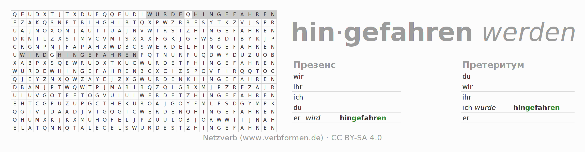 Глагольные таблицы, содержащие все формы глагола hinfahren, для наглядности объединены в одну общую таблицу.