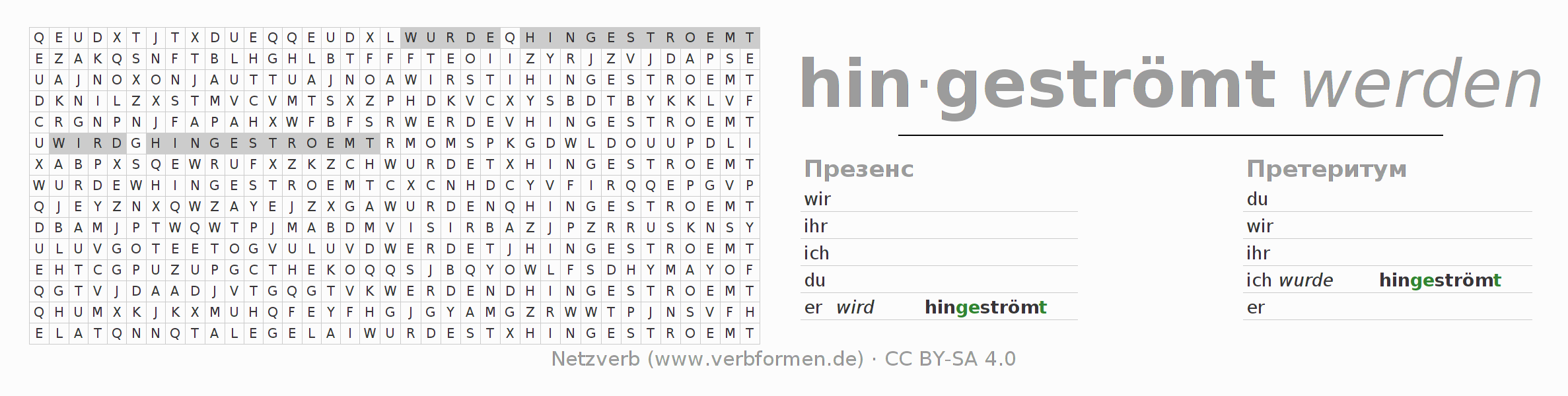 Рабочие материалы служат обучением спряжениям глагола hinströmen на уроке и при самообучении. Рабочие материалы могут быть свободно использованы в рамках лицензии CC BY-SA 4.0 в виде Открытых образовательных ресурсов(ООР) например могут быть бесплатно использованы на уроке. Для этого имеется много различных типов рабочих материалов для глагола hinströmen в наличии. Это таблицы спряжений, головоломки и игры. Весь учебный материал доступен бесплатно как файлы PDF, в виде изображений или как интерактивная версия браузера. В дополнение к задачам, имеются бесчисленные примеры для hinströmen а также помощь в использовании глаголов.