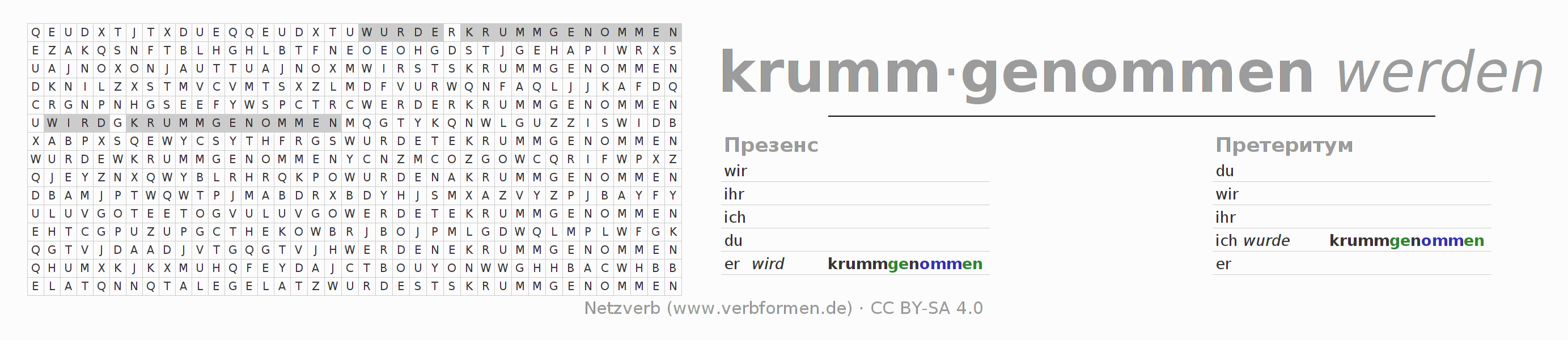 Глагольные таблицы, содержащие все формы глагола krummnehmen, для наглядности объединены в одну общую таблицу.