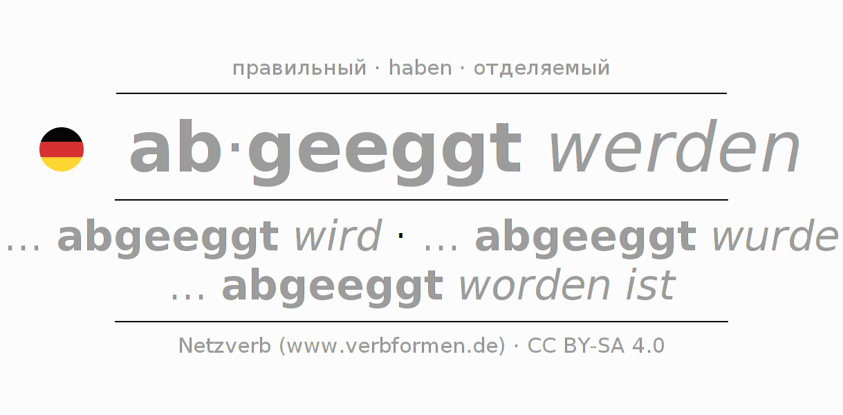 Глагольные таблицы, содержащие все формы глагола abeggen, для наглядности объединены в одну общую таблицу.