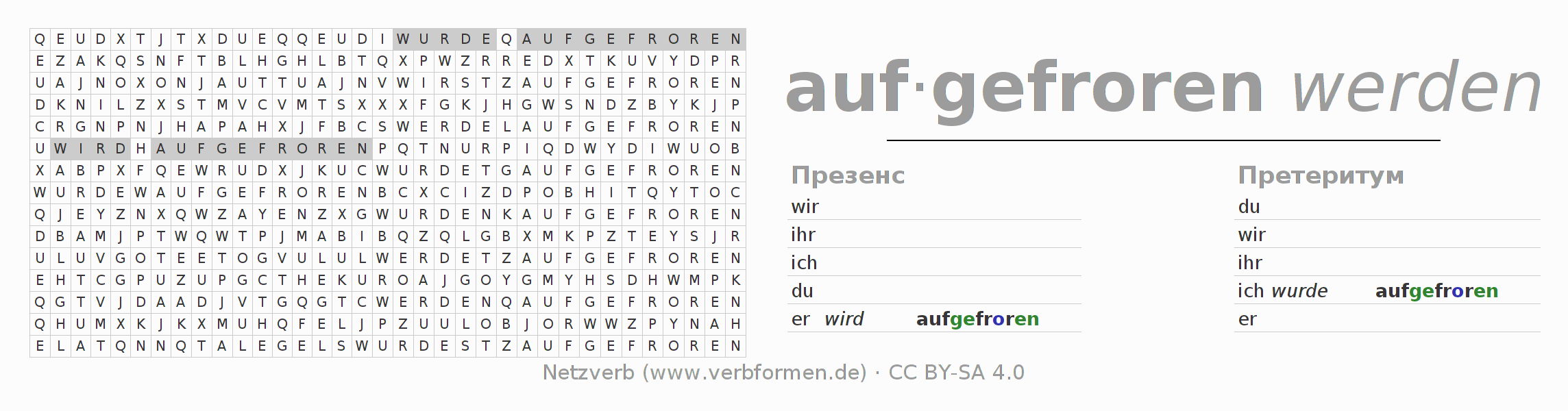 С помощью этих головоломок по поиску слов Вы можете подходящим для Вас способом изучать спряжение немецкого глагола auffrieren.