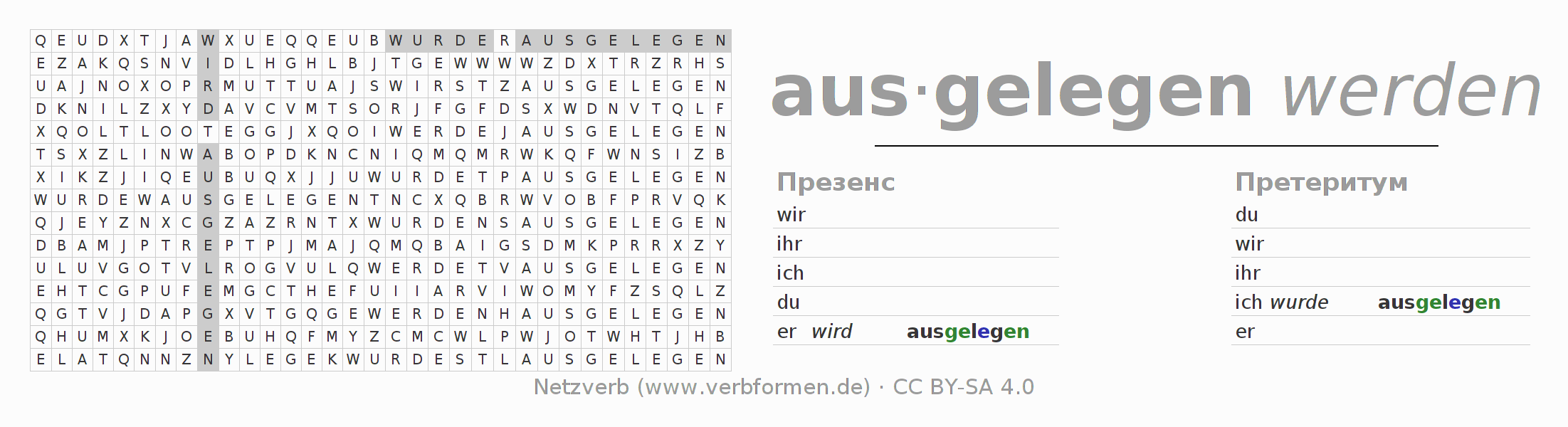 С помощью этих головоломок по поиску слов Вы можете подходящим для Вас способом изучать спряжение немецкого глагола ausliegen.