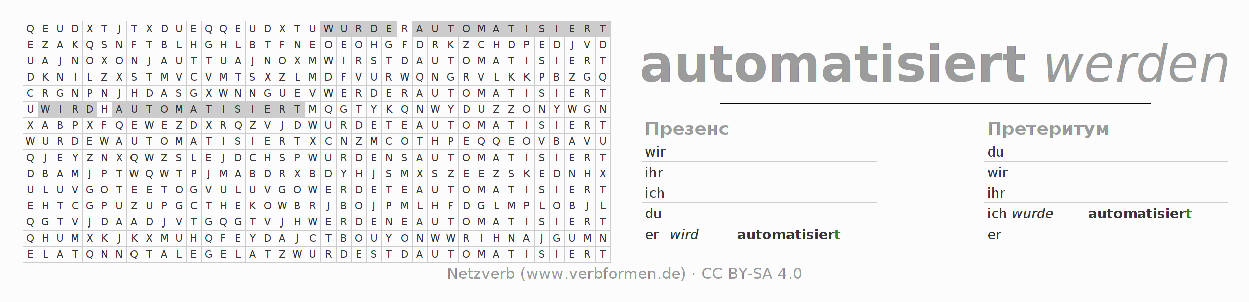 Глагольные таблицы, содержащие все формы глагола automatisieren, для наглядности объединены в одну общую таблицу.