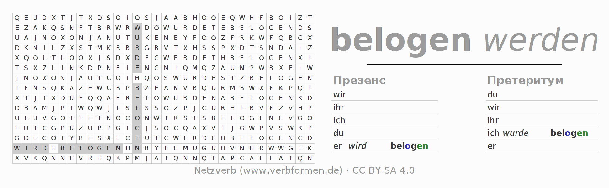 Рабочие материалы служат обучением спряжениям глагола belügen на уроке и при самообучении. Рабочие материалы могут быть свободно использованы в рамках лицензии CC BY-SA 4.0 в виде Открытых образовательных ресурсов(ООР) например могут быть бесплатно использованы на уроке. Для этого имеется много различных типов рабочих материалов для глагола belügen в наличии. Это таблицы спряжений, головоломки и игры. Весь учебный материал доступен бесплатно как файлы PDF, в виде изображений или как интерактивная версия браузера. В дополнение к задачам, имеются бесчисленные примеры для belügen а также помощь в использовании глаголов.