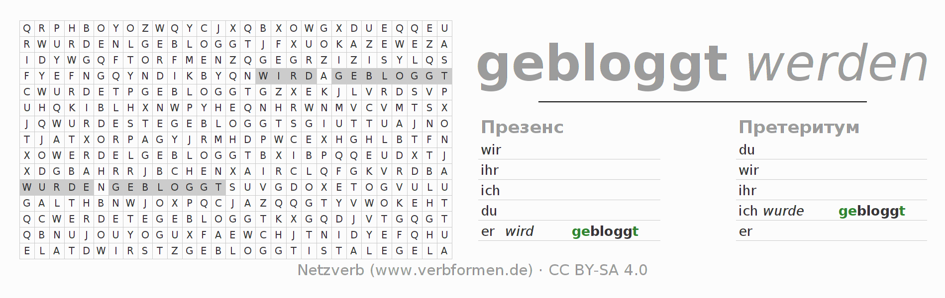 С помощью этих головоломок по поиску слов Вы можете подходящим для Вас способом изучать спряжение немецкого глагола bloggen.
