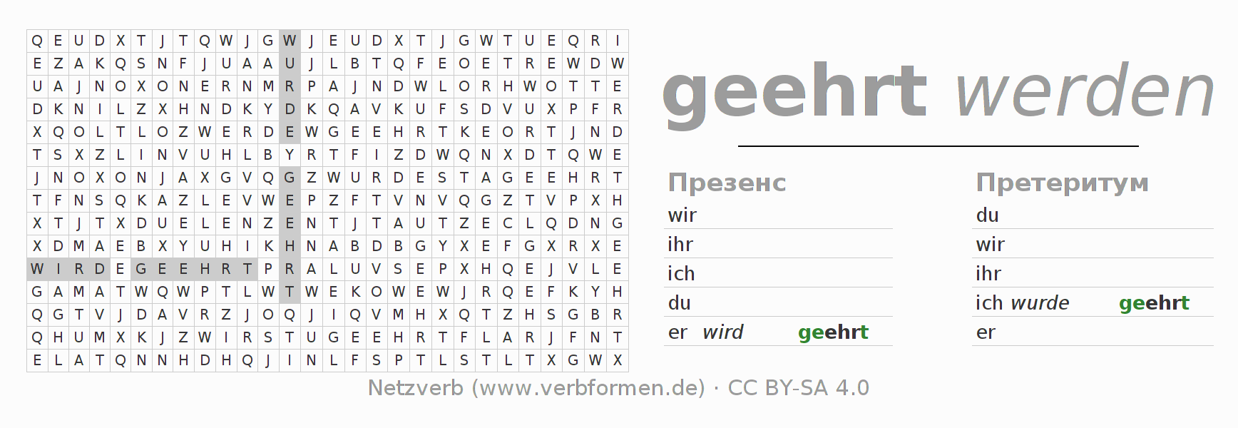 С помощью этих головоломок по поиску слов Вы можете подходящим для Вас способом изучать спряжение немецкого глагола ehren.