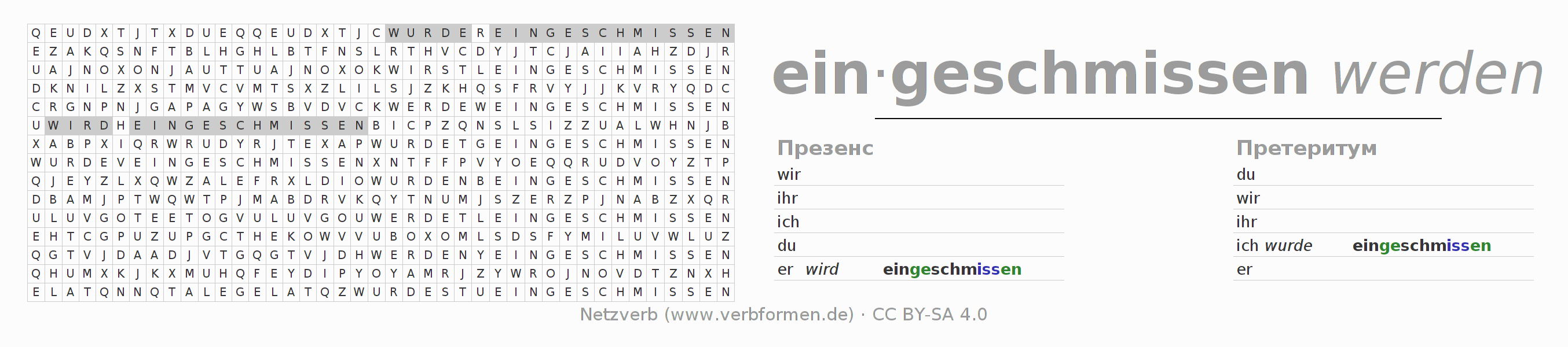 Рабочие материалы служат обучением спряжениям глагола einschmeißen на уроке и при самообучении. Рабочие материалы могут быть свободно использованы в рамках лицензии CC BY-SA 4.0 в виде Открытых образовательных ресурсов(ООР) например могут быть бесплатно использованы на уроке. Для этого имеется много различных типов рабочих материалов для глагола einschmeißen в наличии. Это таблицы спряжений, головоломки и игры. Весь учебный материал доступен бесплатно как файлы PDF, в виде изображений или как интерактивная версия браузера. В дополнение к задачам, имеются бесчисленные примеры для einschmeißen а также помощь в использовании глаголов.