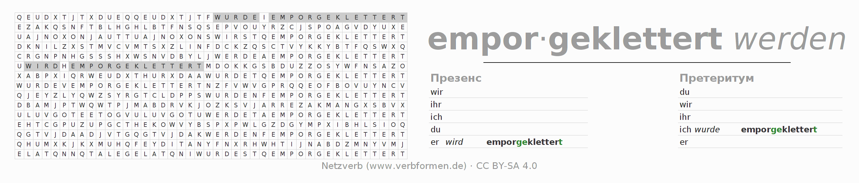 Глагольные таблицы, содержащие все формы глагола emporklettern, для наглядности объединены в одну общую таблицу.