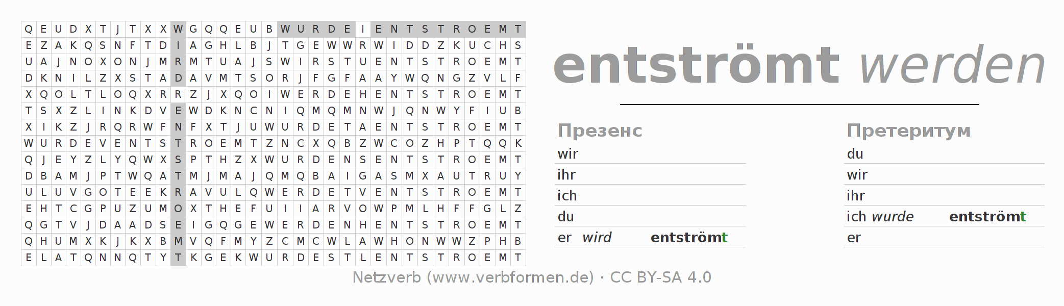 Рабочие материалы служат обучением спряжениям глагола entströmen на уроке и при самообучении. Рабочие материалы могут быть свободно использованы в рамках лицензии CC BY-SA 4.0 в виде Открытых образовательных ресурсов(ООР) например могут быть бесплатно использованы на уроке. Для этого имеется много различных типов рабочих материалов для глагола entströmen в наличии. Это таблицы спряжений, головоломки и игры. Весь учебный материал доступен бесплатно как файлы PDF, в виде изображений или как интерактивная версия браузера. В дополнение к задачам, имеются бесчисленные примеры для entströmen а также помощь в использовании глаголов.