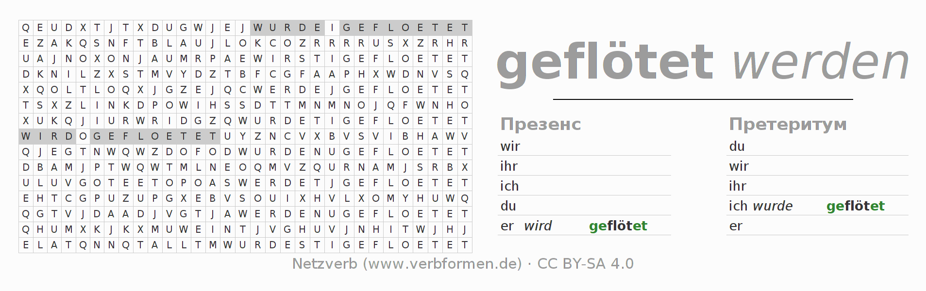 С помощью этих головоломок по поиску слов Вы можете подходящим для Вас способом изучать спряжение немецкого глагола flöten.