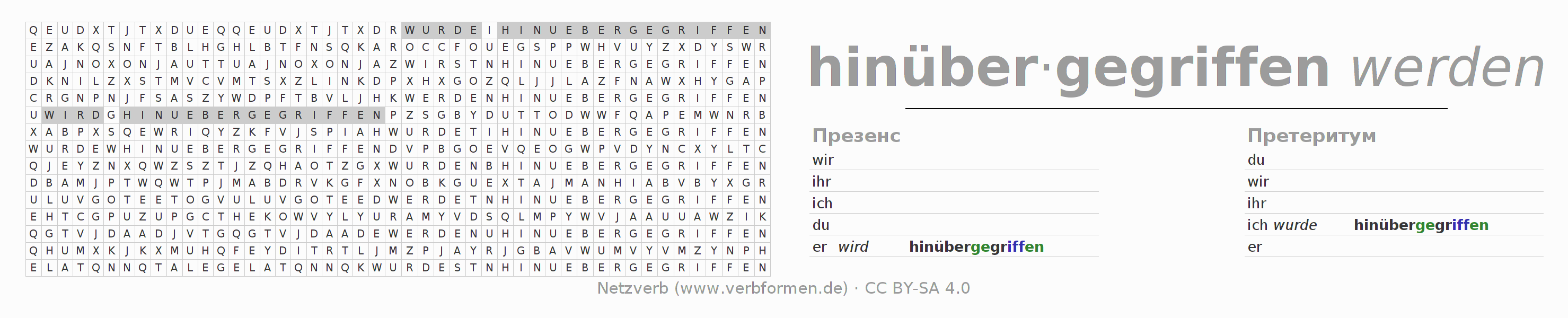 Глагольные таблицы, содержащие все формы глагола hinübergreifen, для наглядности объединены в одну общую таблицу.