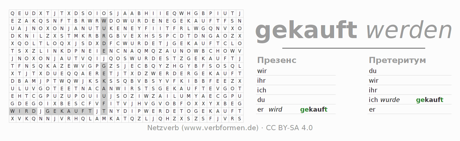С помощью этих головоломок по поиску слов Вы можете подходящим для Вас способом изучать спряжение немецкого глагола kaufen.