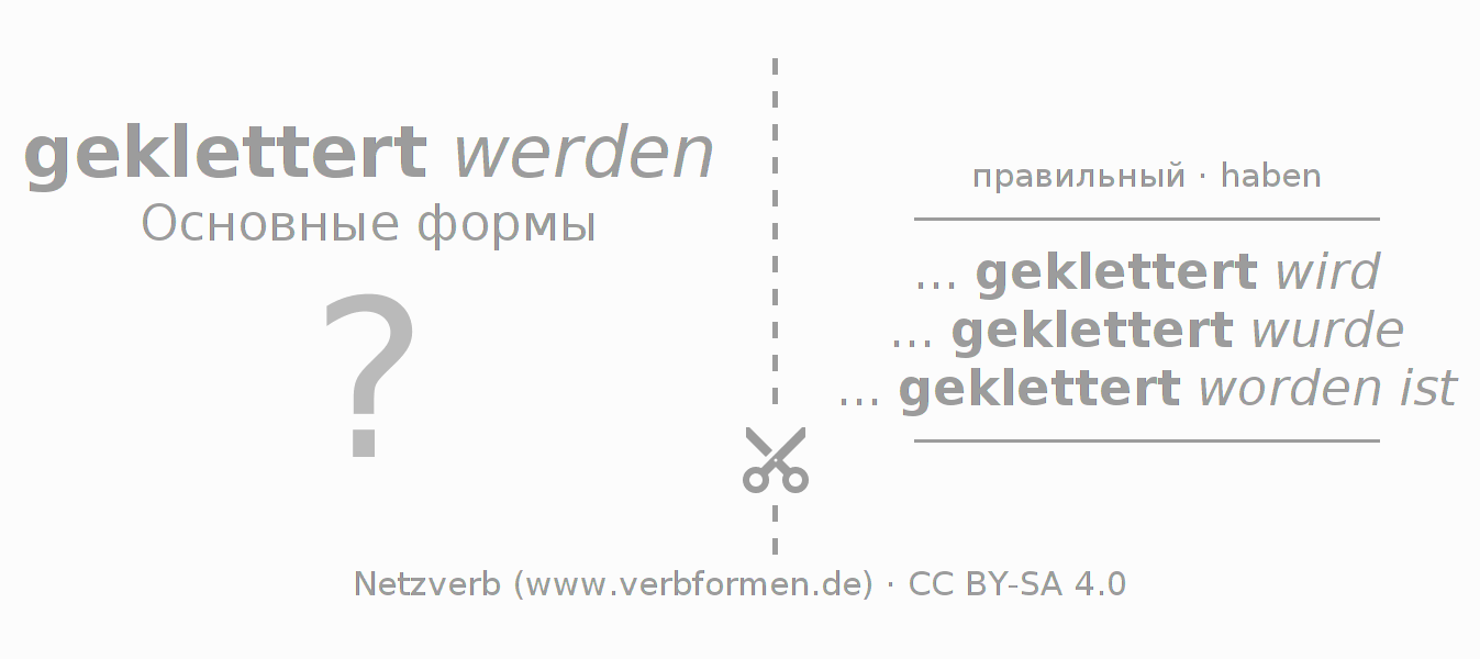 Рабочие материалы служат обучением спряжениям глагола klettern на уроке и при самообучении. Рабочие материалы могут быть свободно использованы в рамках лицензии CC BY-SA 4.0 в виде Открытых образовательных ресурсов(ООР) например могут быть бесплатно использованы на уроке. Для этого имеется много различных типов рабочих материалов для глагола klettern (hat) в наличии. Это таблицы спряжений, головоломки и игры. Весь учебный материал доступен бесплатно как файлы PDF, в виде изображений или как интерактивная версия браузера. В дополнение к задачам, имеются бесчисленные примеры для klettern а также помощь в использовании глаголов.