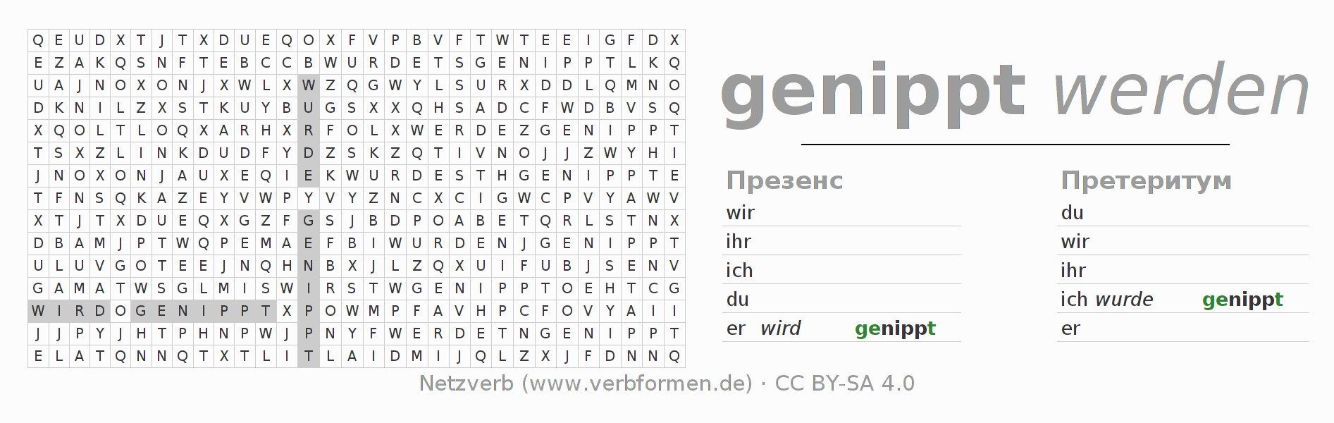 С помощью этих головоломок по поиску слов Вы можете подходящим для Вас способом изучать спряжение немецкого глагола nippen.