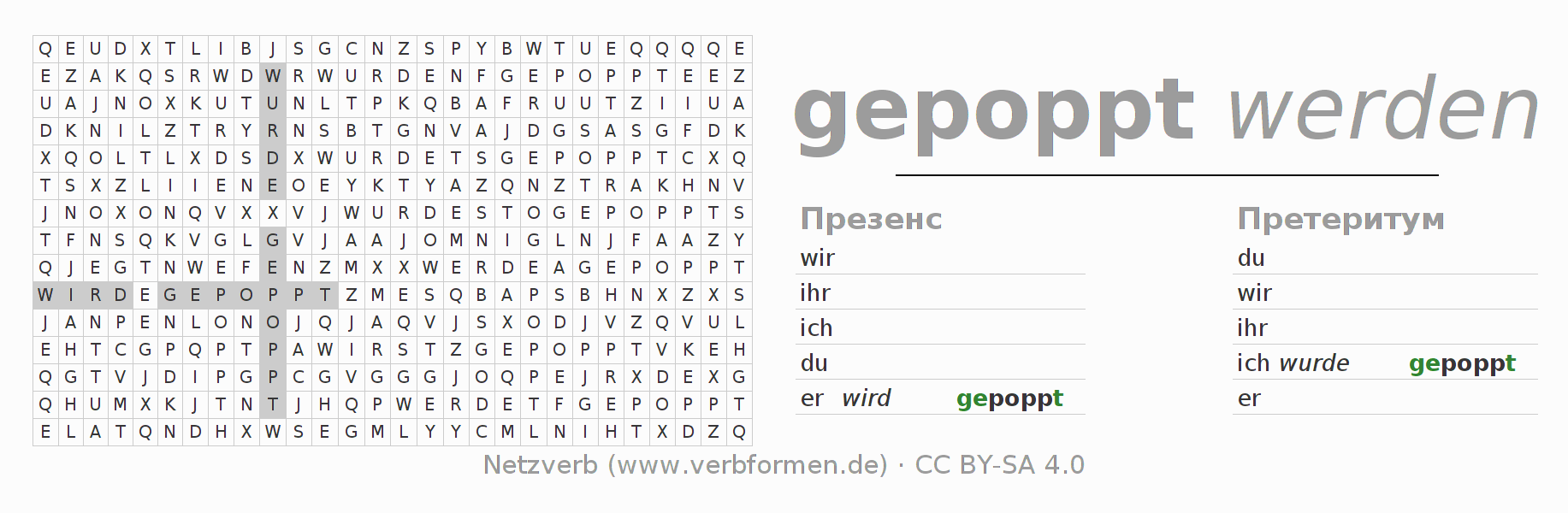 С помощью этих головоломок по поиску слов Вы можете подходящим для Вас способом изучать спряжение немецкого глагола poppen.