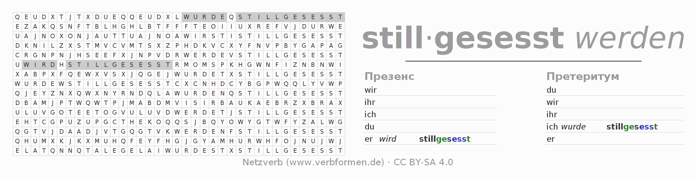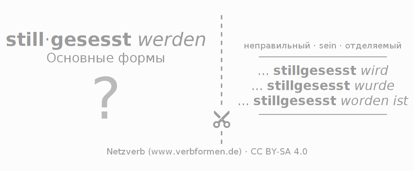 Глагольные таблицы, содержащие все формы глагола stillsitzen, для наглядности объединены в одну общую таблицу.