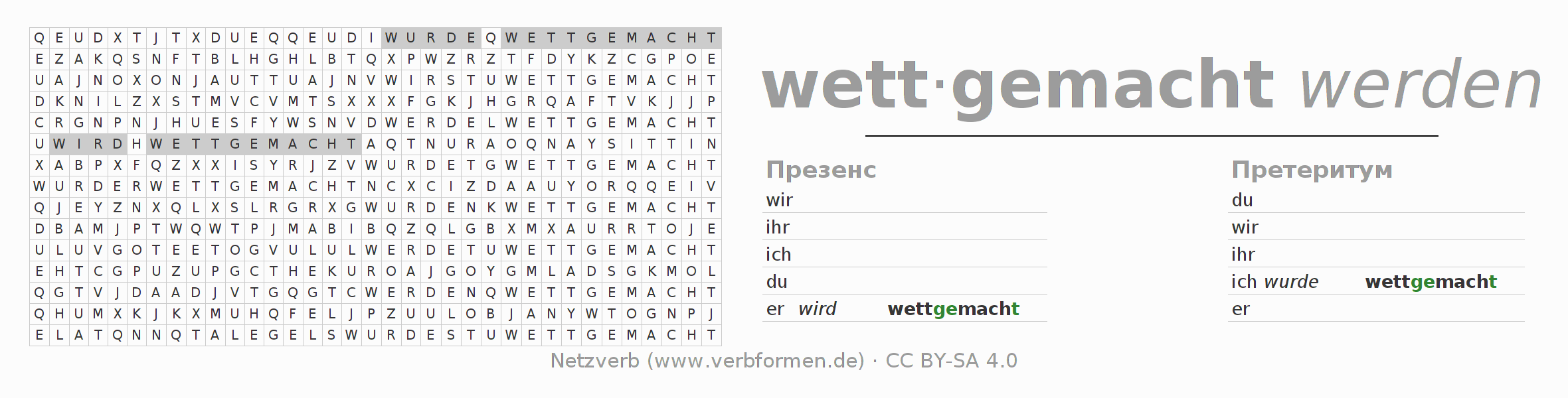 С помощью этих головоломок по поиску слов Вы можете подходящим для Вас способом изучать спряжение немецкого глагола wettmachen.