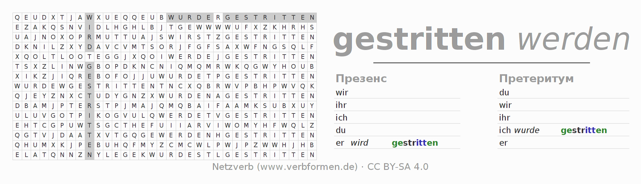 Рабочие материалы служат обучением спряжениям глагола streiten на уроке и при самообучении. Рабочие материалы могут быть свободно использованы в рамках лицензии CC BY-SA 4.0 в виде Открытых образовательных ресурсов(ООР) например могут быть бесплатно использованы на уроке. Для этого имеется много различных типов рабочих материалов для глагола streiten в наличии. Это таблицы спряжений, головоломки и игры. Весь учебный материал доступен бесплатно как файлы PDF, в виде изображений или как интерактивная версия браузера. В дополнение к задачам, имеются бесчисленные примеры для streiten а также помощь в использовании глаголов.