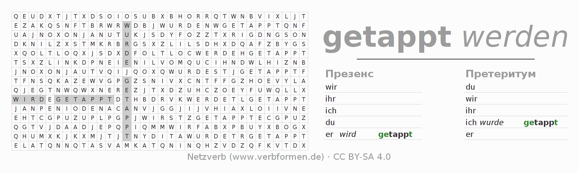 С помощью этих головоломок по поиску слов Вы можете подходящим для Вас способом изучать спряжение немецкого глагола tappen.