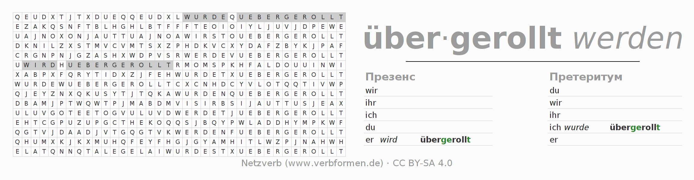 С помощью этих головоломок по поиску слов Вы можете подходящим для Вас способом изучать спряжение немецкого глагола überrollen.