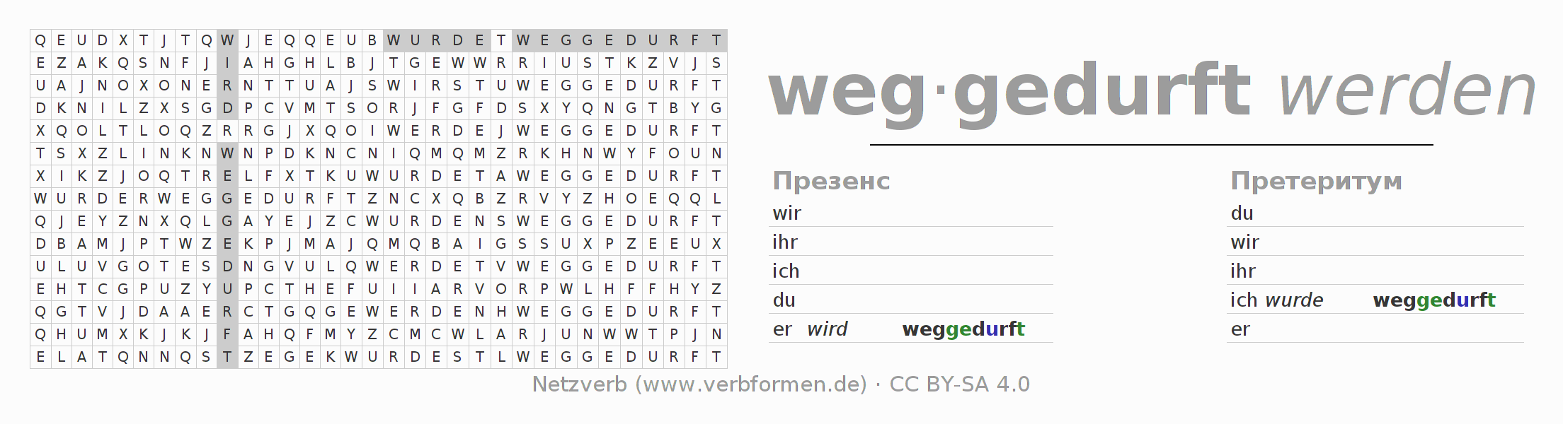Рабочие материалы служат обучением спряжениям глагола wegdürfen на уроке и при самообучении. Рабочие материалы могут быть свободно использованы в рамках лицензии CC BY-SA 4.0 в виде Открытых образовательных ресурсов(ООР) например могут быть бесплатно использованы на уроке. Для этого имеется много различных типов рабочих материалов для глагола wegdürfen в наличии. Это таблицы спряжений, головоломки и игры. Весь учебный материал доступен бесплатно как файлы PDF, в виде изображений или как интерактивная версия браузера. В дополнение к задачам, имеются бесчисленные примеры для wegdürfen а также помощь в использовании глаголов.