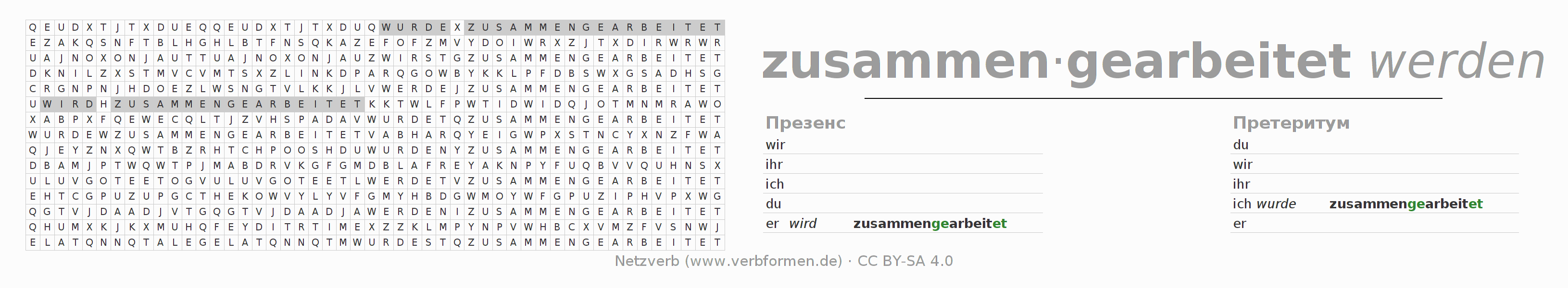 Глагольные таблицы, содержащие все формы глагола zusammenarbeiten, для наглядности объединены в одну общую таблицу.
