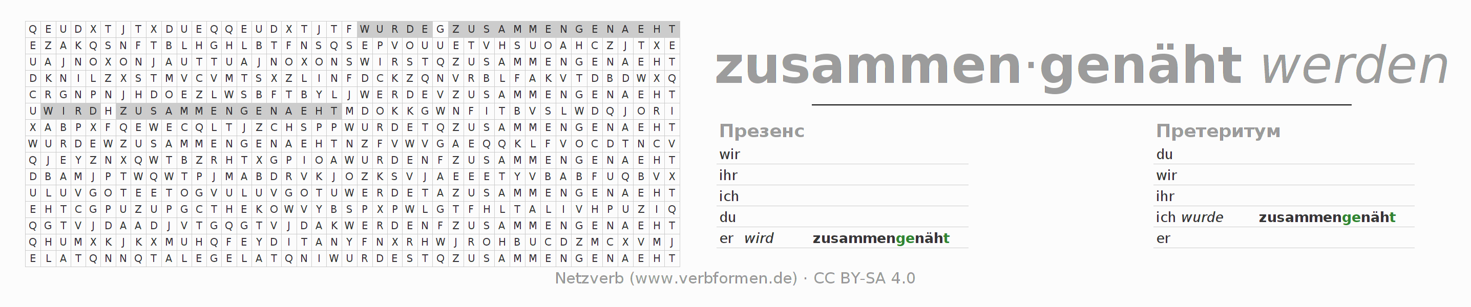 Глагольные таблицы, содержащие все формы глагола zusammennähen, для наглядности объединены в одну общую таблицу.