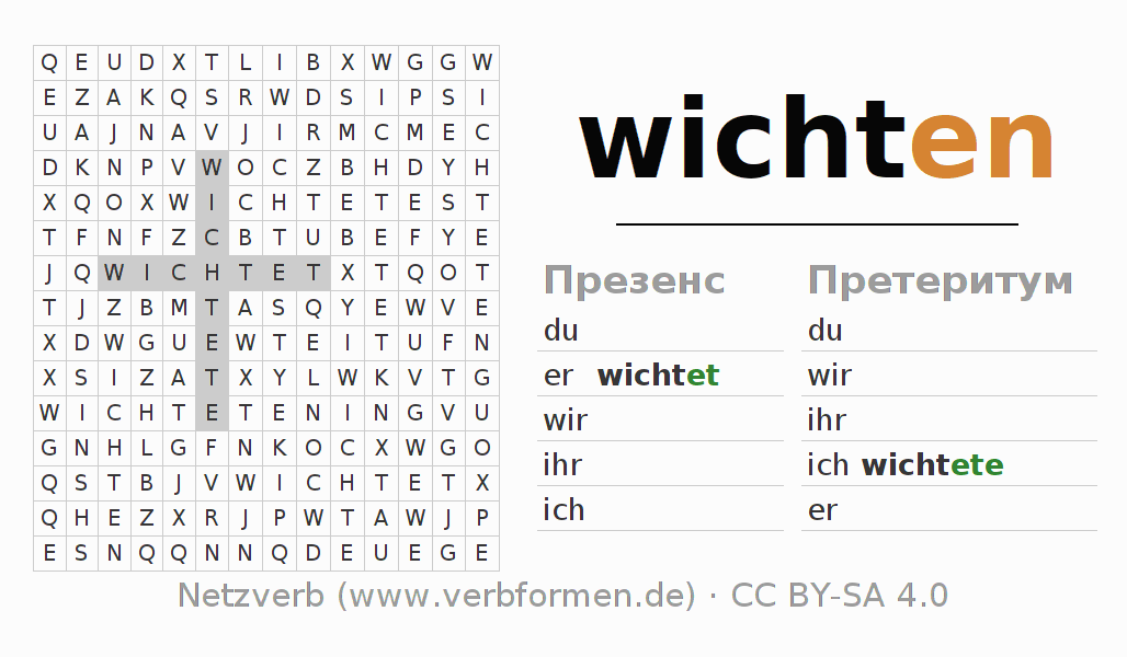 С помощью этих головоломок по поиску слов Вы можете подходящим для Вас способом изучать спряжение немецкого глагола wichten.