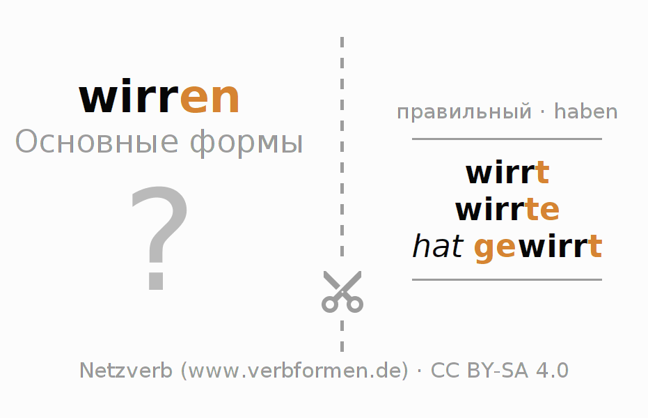 Глагольные таблицы, содержащие все формы глагола wirren, для наглядности объединены в одну общую таблицу.