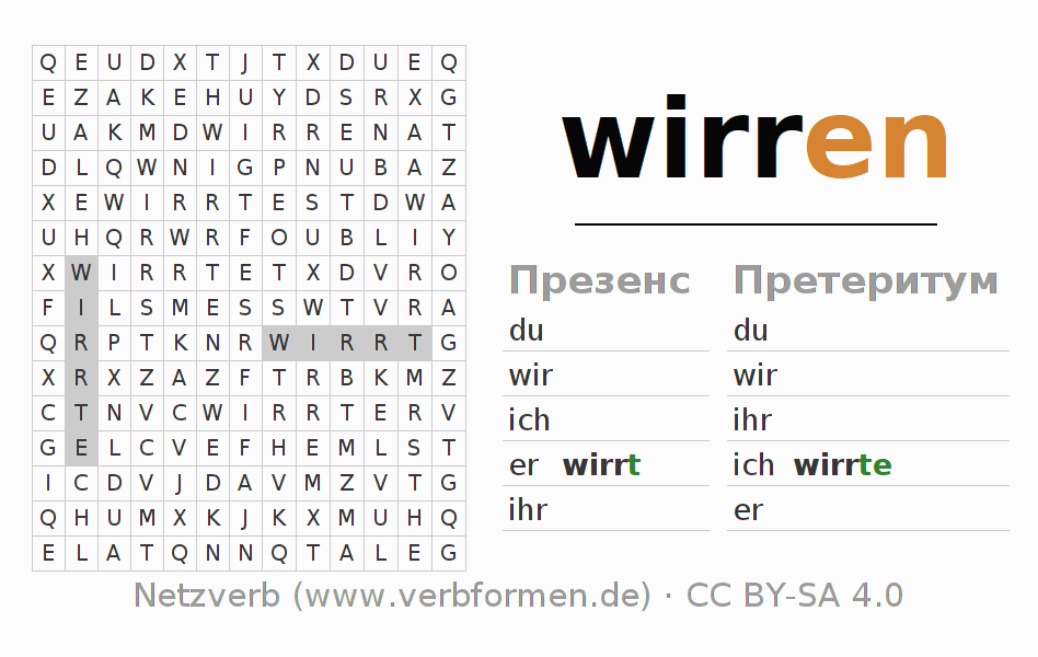 Рабочие материалы служат обучением спряжениям глагола wirren на уроке и при самообучении. Рабочие материалы могут быть свободно использованы в рамках лицензии CC BY-SA 4.0 в виде Открытых образовательных ресурсов(ООР) например могут быть бесплатно использованы на уроке. Для этого имеется много различных типов рабочих материалов для глагола wirren в наличии. Это таблицы спряжений, головоломки и игры. Весь учебный материал доступен бесплатно как файлы PDF, в виде изображений или как интерактивная версия браузера. В дополнение к задачам, имеются бесчисленные примеры для wirren а также помощь в использовании глаголов.