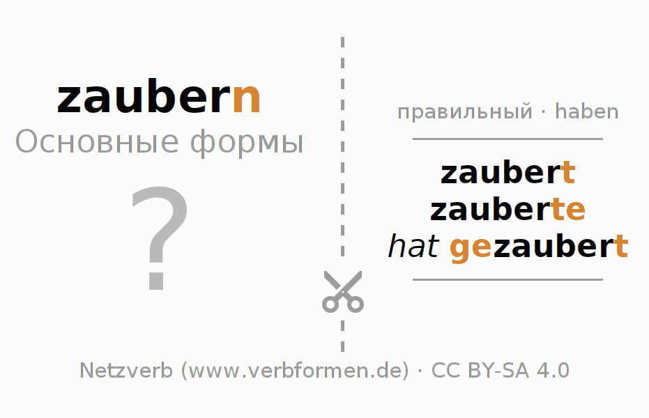 Глагольные таблицы, содержащие все формы глагола zaubern, для наглядности объединены в одну общую таблицу.