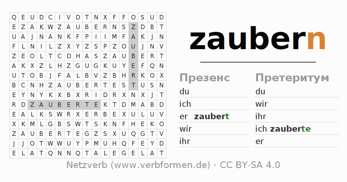 Рабочие материалы служат обучением спряжениям глагола zaubern на уроке и при самообучении. Рабочие материалы могут быть свободно использованы в рамках лицензии CC BY-SA 4.0 в виде Открытых образовательных ресурсов(ООР) например могут быть бесплатно использованы на уроке. Для этого имеется много различных типов рабочих материалов для глагола zaubern в наличии. Это таблицы спряжений, головоломки и игры. Весь учебный материал доступен бесплатно как файлы PDF, в виде изображений или как интерактивная версия браузера. В дополнение к задачам, имеются бесчисленные примеры для zaubern а также помощь в использовании глаголов.