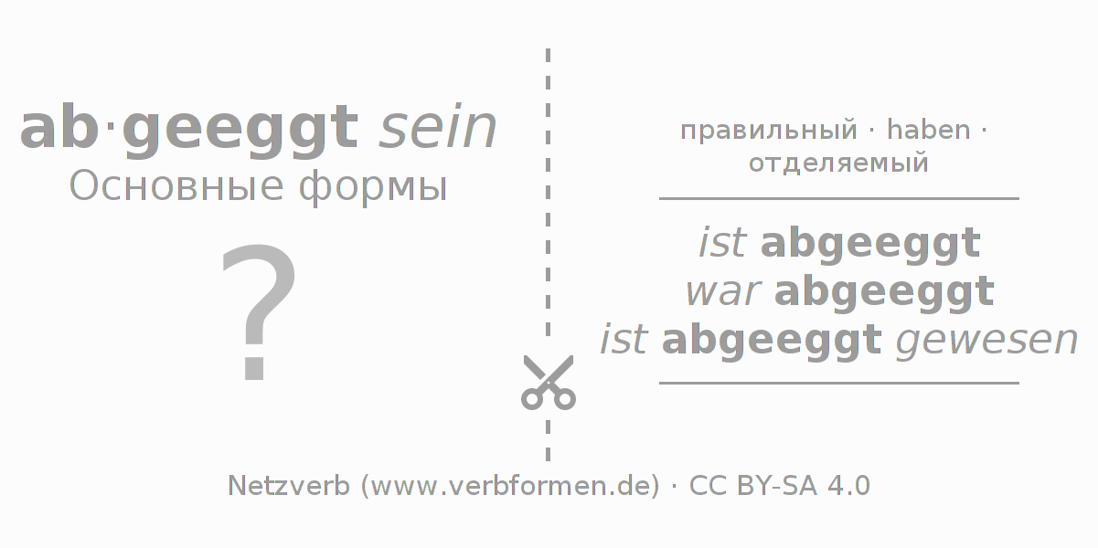 Рабочие материалы служат обучением спряжениям глагола abeggen на уроке и при самообучении. Рабочие материалы могут быть свободно использованы в рамках лицензии CC BY-SA 4.0 в виде Открытых образовательных ресурсов(ООР) например могут быть бесплатно использованы на уроке. Для этого имеется много различных типов рабочих материалов для глагола abeggen в наличии. Это таблицы спряжений, головоломки и игры. Весь учебный материал доступен бесплатно как файлы PDF, в виде изображений или как интерактивная версия браузера. В дополнение к задачам, имеются бесчисленные примеры для abeggen а также помощь в использовании глаголов.
